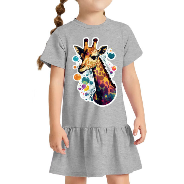 The design is printed on a soft, comfortable, 100% combed ringspun cotton short-sleeve dress. Colorful Giraffe Toddler Rib Dress will become a staple in your child’s wardrobe.