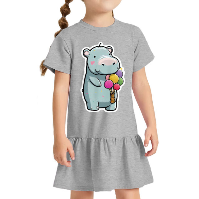 The design is printed on a soft, comfortable, 100% combed ringspun cotton short-sleeve dress. Hippo With Balloons Toddler Rib Dress will become a staple in your child’s wardrobe.